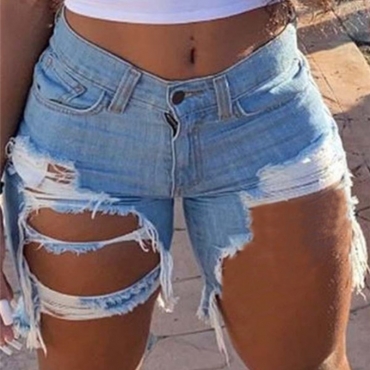 Lovely Casual High-waisted Broken Holes Baby Blue Denim Shorts