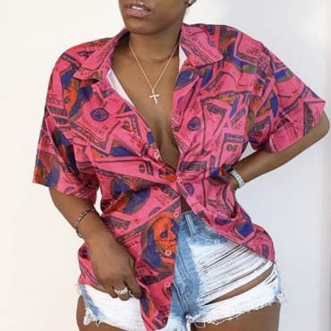 Lovely Casual Turndown Collar Print Red Blouse