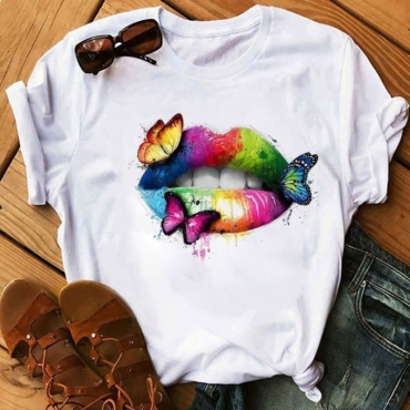 Lovely Casual O Neck Lip Print Multicolor T-shirt