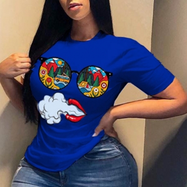 Lovely Casual O Neck Print Blue Plus Size T-shirt