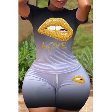 Lovely Casual O Neck Lip Print Black Plus Size Two-piece Shorts Set