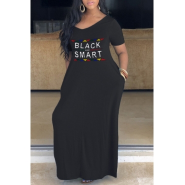 Lovely Casual O Neck Letter Black Ankle Length Plus Size Dress