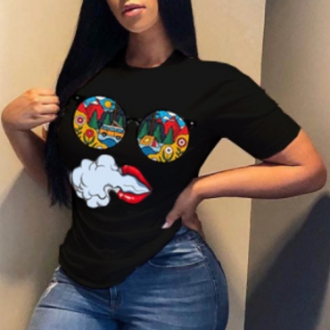 lovely Chic O Neck Print Black T-shirt