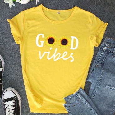 Lovely Casual O Neck Print Yellow Plus Size T-shirt