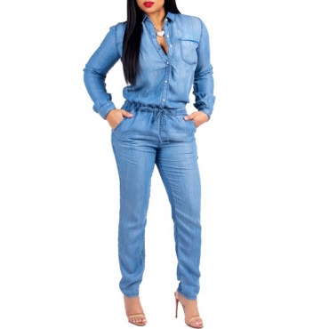 Lovely Stylish Buttons Design Blue Denim One-piece Jumpsuit