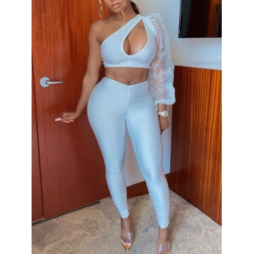 Lovely Sexy One Shoulder Hollow-out White Two Piece Pants Set