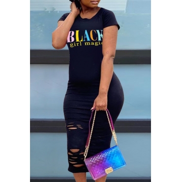 Lovely Leisure O Neck Letter Black Mid Calf Plus Size Dress