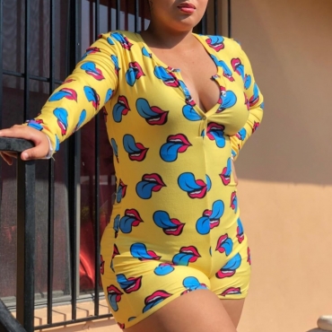 Lovely Leisure Lip Print Yellow Plus Size One-piece Romper