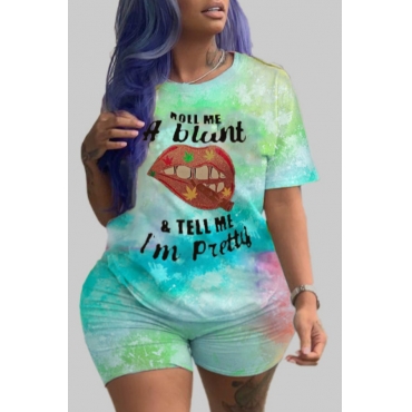 Lovely Casual Lip Print Green Plus Size Two-piece Shorts Set