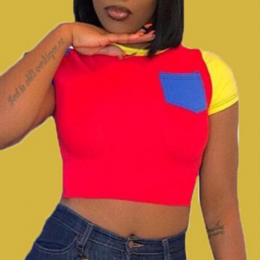 Lovely Casual O Neck Patchwork Red T-shirt