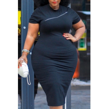 Lovely Leisure Zipper Design Black Mid Calf Plus Size Dress