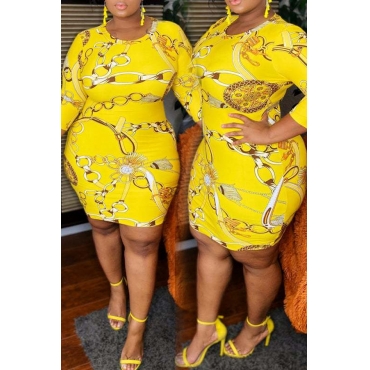 Lovely Casual Print Yellow Mini Plus Size Dress