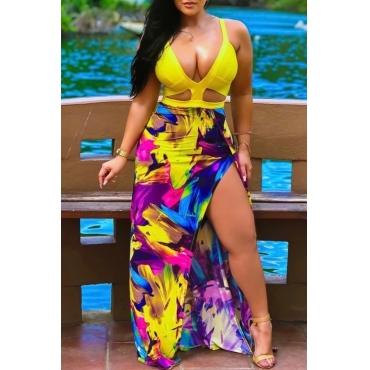 Lovely Trendy Deep V Neck Print Yellow Maxi Plus Size Dress