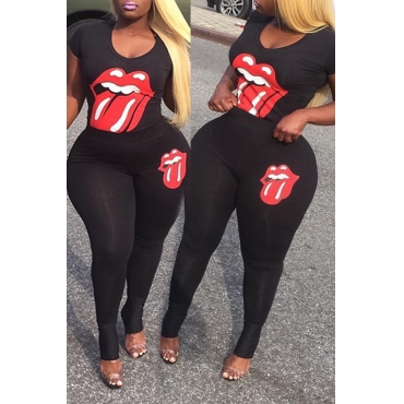 Lovely Leisure Lip Print Black Plus Size Two-piece Pants Set