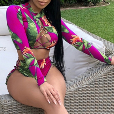 Lovely Plants Print Rose Red Two-piece Swimsuit