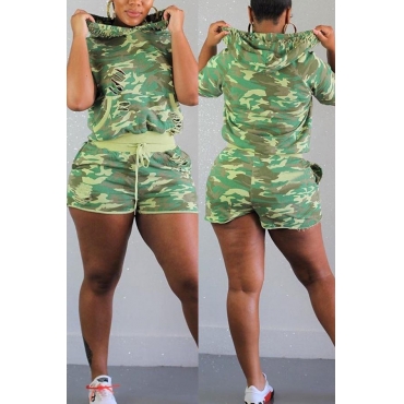 Lovely Sportswear Camo Print Green Two-piece Shorts Set