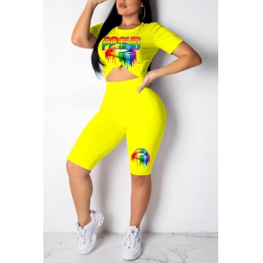 Lovely Casual Print Yellow Two-piece Shorts Set
