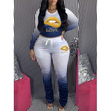 Lovely Sportswear O Neck Lip Print Fold Design Blue Plus Size Two-piece Pants Set
