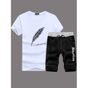 Lovely Men Casual O Neck Letter Print White Two-piece Shorts Set
