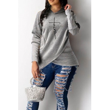 Lovely Trendy Hooded Collar Letter Print Asymmetrical Grey Hoodie