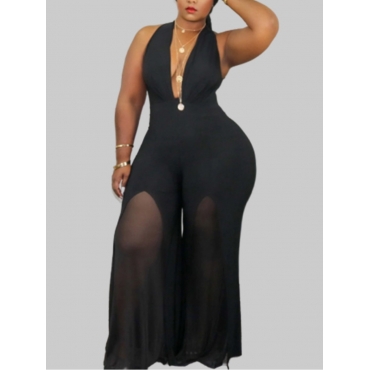 Lovely Sexy Deep V Neck See-through Black Plus Size One-piece Jumpsuit