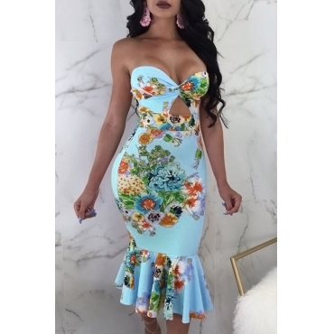 Lovely Chic Print Flounce Baby Blue Mid Calf Dress