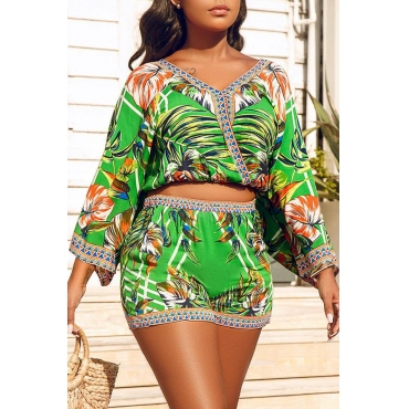 Lovely Chic V Neck Print Green Two-piece Shorts Set