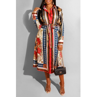 Lovely Casual Turndown Collar Print Red Mid Calf Dress