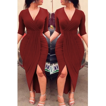 Lovely Chic V Neck Ruffle Design Purplish Red Ankle Length Dress
