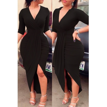 Lovely Chic V Neck Ruffle Design Black Ankle Length Dress