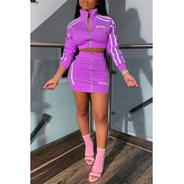 Lovely Casual Letter Zipper Design Purple Two-piece Skirt Set