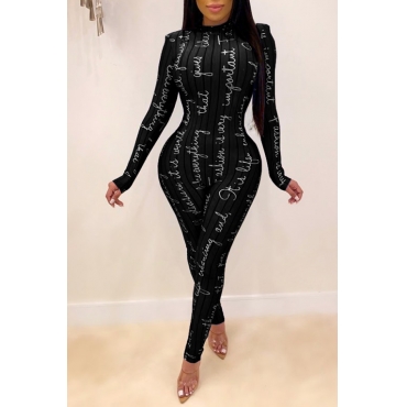 Lovely Chic Letter Print Skinny Black One-piece Jumpsuit