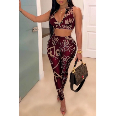 Lovely Sexy Sleeveless Printed Wine Red Two-piece Pants Set