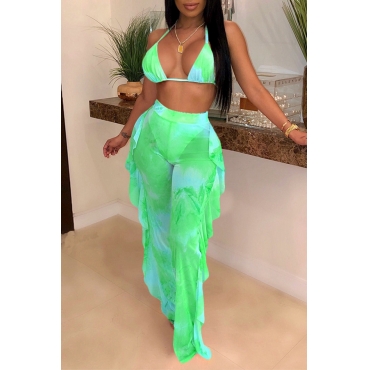 Lovely Printed Ruffle Design Green Two-piece Swimwear