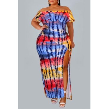 Lovely Casual Off The Shoulder Printed Side Split Multicolor Ankle Length Plus Size Dress