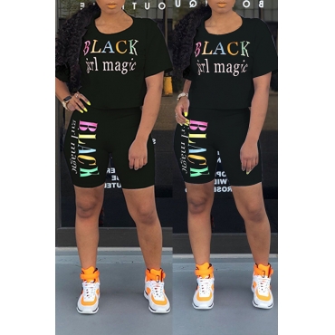 Lovely Casual O Neck Letter Printed Black Two-piece Shorts Set