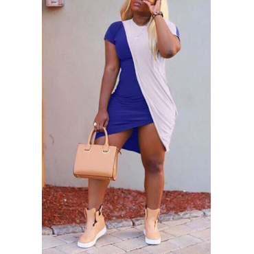 Lovely Casual O Neck Patchwork Blue Asymmetrical Mini Dress