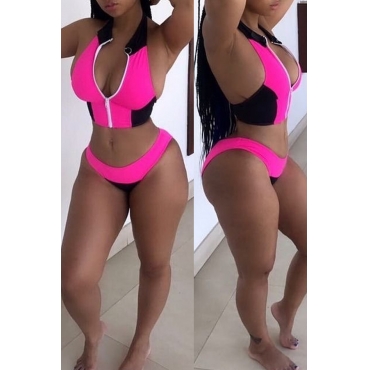 Lovely Zipper Design Patchwork Rose Red Two-piece Swimwear
