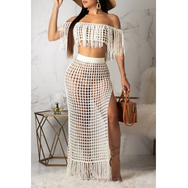 Lovely Off The Shoulder Tassel Design White Cover-up(Top+Bottoms)