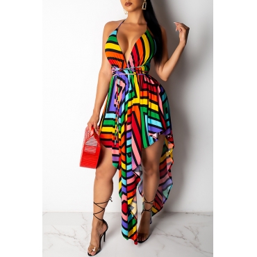 Lovely Sexy Deep V Neck Striped Printed Asymmetrical Mini Dress
