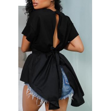 Lovely Trendy Round Neck Irregular Design Drawstring Black Cotton Shirts