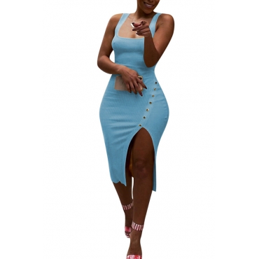 Lovely Casual Side Split Baby Blue Knee Length Dress(With Elastic)