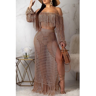 Lovely Sexy Hollow-out Tassel Design Khaki Two-piece Skirt Set(Without Lining)