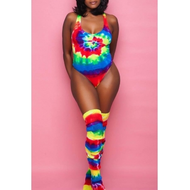 Lovely U Neck Tie-dye Blue One-piece Swimwear(With Socks)