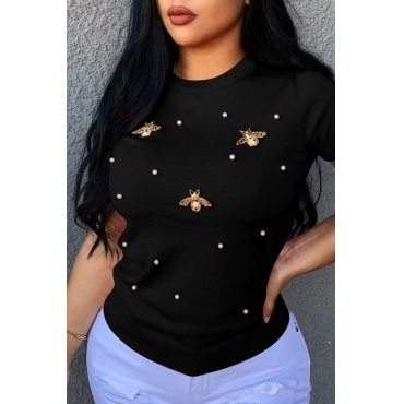 Lovely Leisure Pearls Decoration Black T-shirt