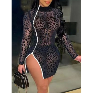 Lovely Street See-through Leopard Print Patchwork Split Black Mini Dress