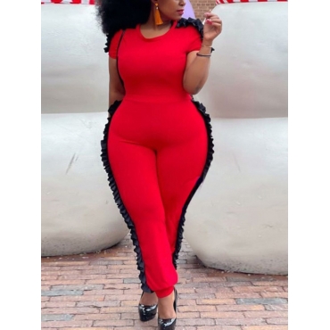 Lovely Casual O Neck Flounce Design Patchwork Red Plus Size One-piece Jumpsuit