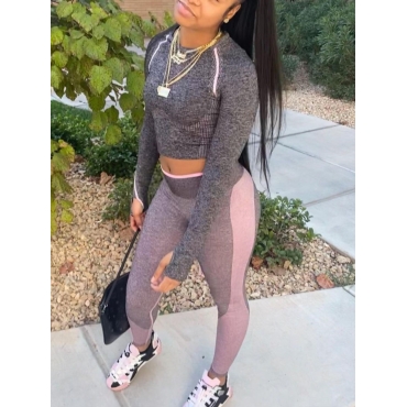 Lovely Sportswear O Neck Patchwork Grey Black Two Piece Pants Set