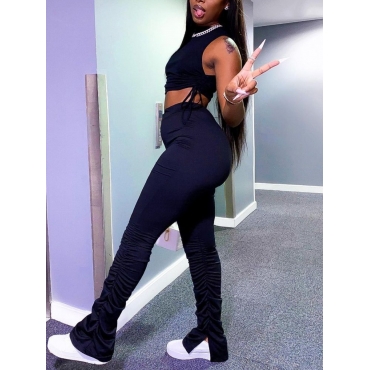 Lovely Chic Ruched Drawstring Black Two Piece Pants Set