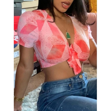 Lovely Chic V Neck Geometric Print Bandage Design Red T-shirt